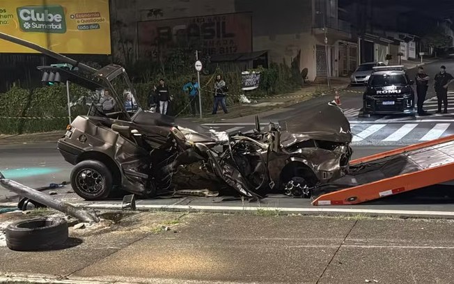Testemunhas relataram à Polícia Civil que o carro trafegava em alta velocidade no momento da colisão. O carro foi retirado do local completamente destruído.