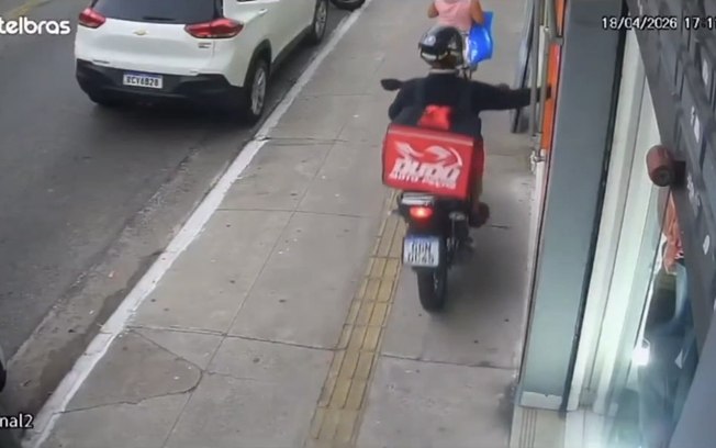 O vídeo feito por uma câmera de monitoramento flagrou o falso entregador subindo na calçada com a moto e roubando o aparelhor de uma mulher que estava na porta de um estabelecimento. A vítima ainda tentou correr atrás do suspeito, porém a ação dele foi muito rápida. Veja o vídeo: