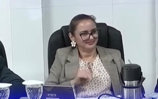 Na sequência, Susenilda Costa faz um gesto com uma das mãos de conotação sexual. Após o ato, ela ri e interage com os demais colegas presentes na reunião da Câmara Municipal de Ubajara.