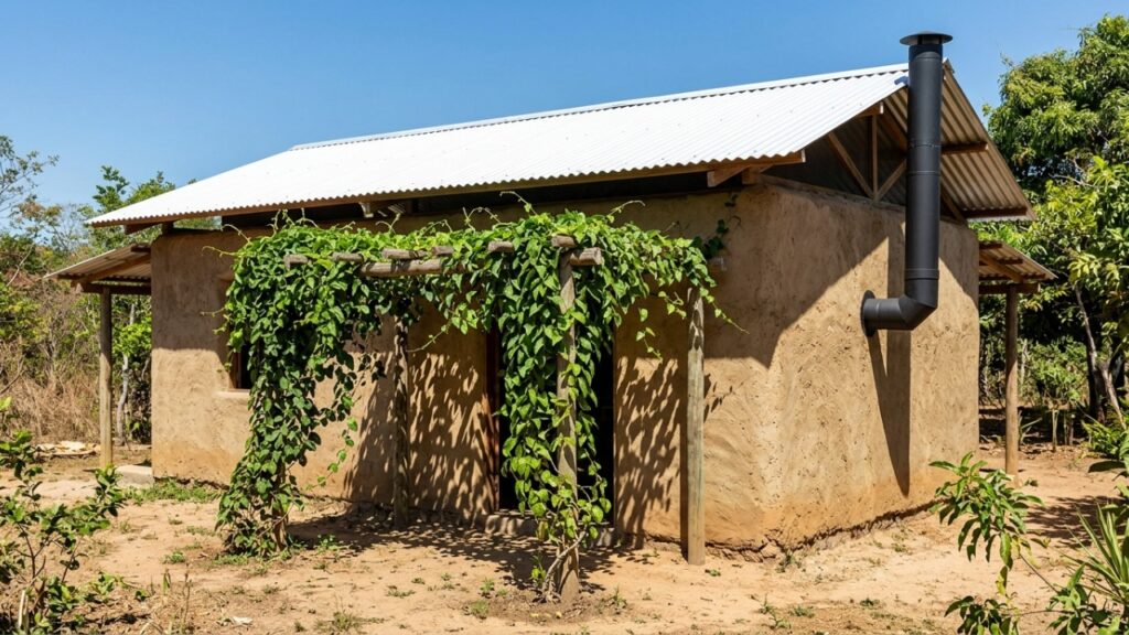 Você acredita que uma casa de telhado de zinco pode ficar 15 °C mais fresca que o lado de fora sem ar-condicionado? Uma construção real conseguiu esse feito com terra, cal, PVC preto e plantas. O segredo está numa chaminé solar que suga o ar quente, um reboco de barro que atrasa o calor e uma parede de trepadeiras que resfria o vento antes de entrar.