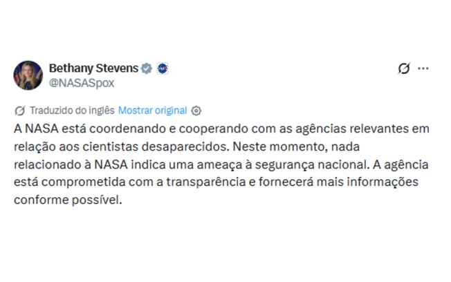Em nota, a NASA informou que está colaborando com as investigações: “A NASA está coordenando e cooperando com as agências relevantes em relação aos cientistas desaparecidos. Neste momento, não há indícios de ameaça à segurança nacional diretamente relacionada à agência.”