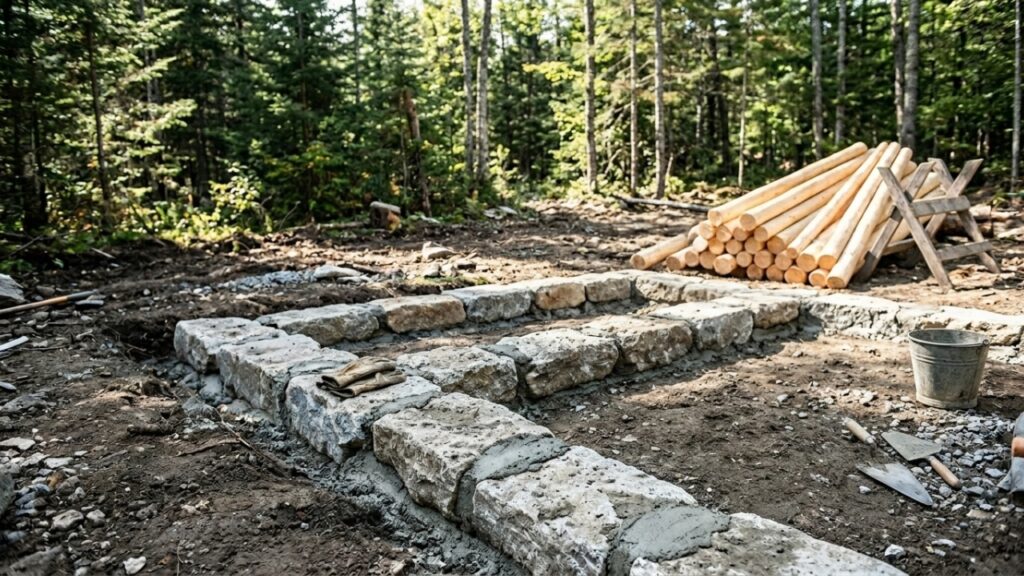 | Base | Pedras + cimento úmido | Suporte estável para as paredes de madeira |