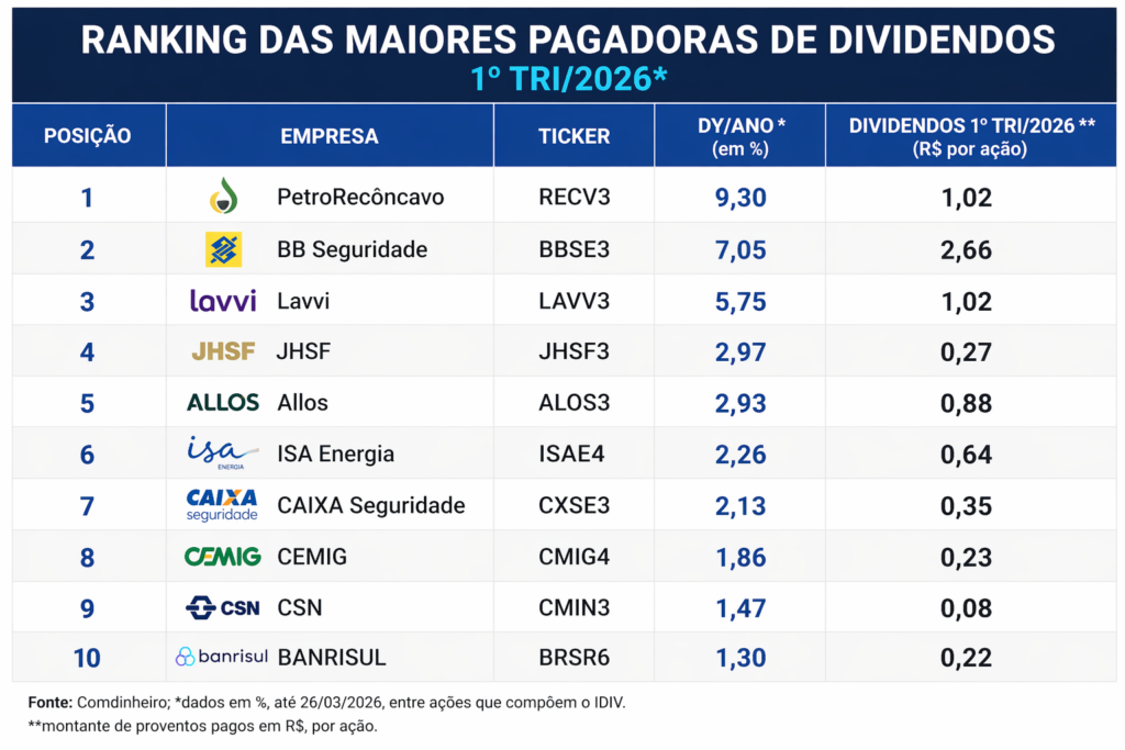 O primeiro trimestre de 2026 foi marcado por forte valorização do mercado acionário brasileiro, com impacto direto na atratividade das empresas pagadoras de dividendos. De janeiro a março, o Ibovespa avançou 16,44%, enquanto o Índice de Dividendos (IDIV) subiu 15,13%, refletindo o movimento de realocação global de recursos para mercados emergentes. Nesse cenário, levantamento da Comdinheiro/Nelogica identificou as dez empresas com maior Dividend Yield (DY) entre as 52 companhias que compõem o IDIV.