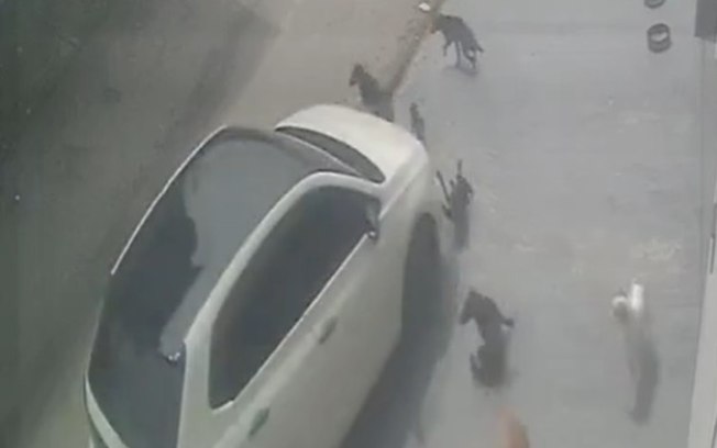Pelas imagens, é possível ver o momento exato em que o suspeito sobe com o veículo no passeio e atinge os cães. Em seguida, ele retorna para a rua e foge.