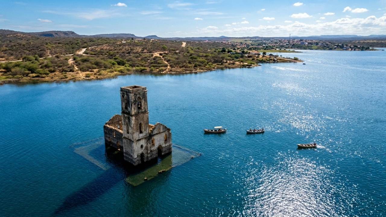 No sertão de Pernambuco, a cerca de 470 km de Recife, uma torre de igreja surge das águas do Rio São Francisco sempre que a seca aperta. É a única ruína visível de Petrolândia, cidade inteira que foi submersa em 1988 para formar o reservatório da Usina Hidrelétrica Luiz Gonzaga. Casas, ruas, praças e igrejas ficaram no fundo, e apenas parte do telhado e da fachada da Igreja do Sagrado Coração de Jesus ainda desafia o tempo no meio do lago.