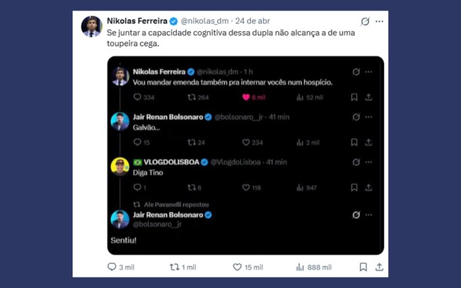 Mais cedo, em seu perfil na rede social X, Nikolas Ferreira fez críticas a Jair Renan e ao influenciador digital bolsonarista Junior Japa.