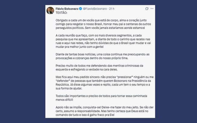 Em resposta ao pedido de pacificação feito por Flávio, Nikolas publicou um texto afirmando que vem sendo alvo de provocações há três anos e que, até agora, vinha se mantendo em silêncio.