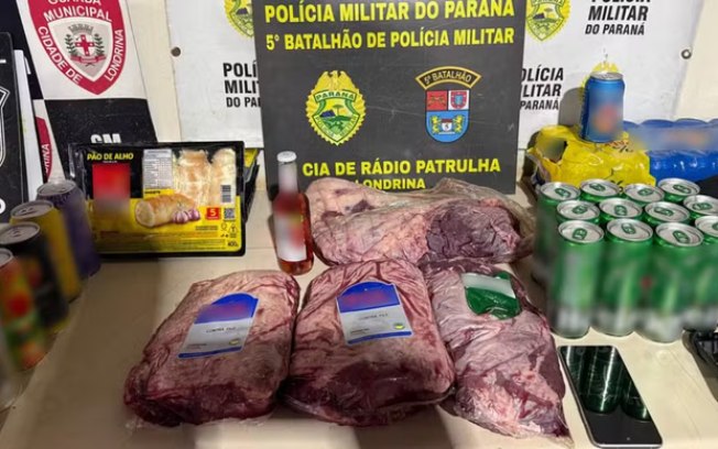 No local, os policiais detiveram os três suspeitos e apreenderam alimentos e bebidas furtados, incluindo latas de cerveja e energético, quatro pacotes de carne e pães de alho.