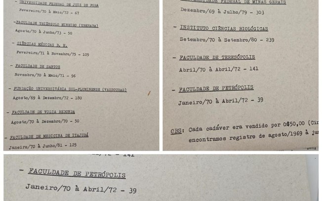 Entre as instituições que receberam os corpos estão universidades federais e faculdades de diferentes estados, segundo levantamento feito por Daniela Arbex, na Fundação Hospitalar de Minas.