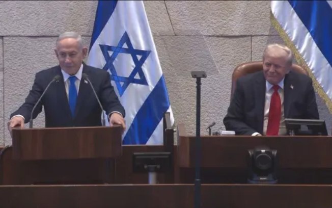 O primeiro-ministro israelense, Benjamin Netanyahu (E), e o presidente dos Estados Unidos, Donald Trump (D) no Parlamento de Israel, em JerusalémReprodução/Youtube