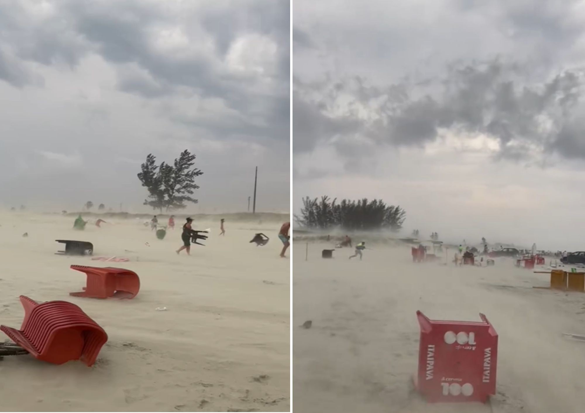 Rajadas de vento de 70 km/h arrastaram mesas e cadeiras de banhistas em Ilha Comprida