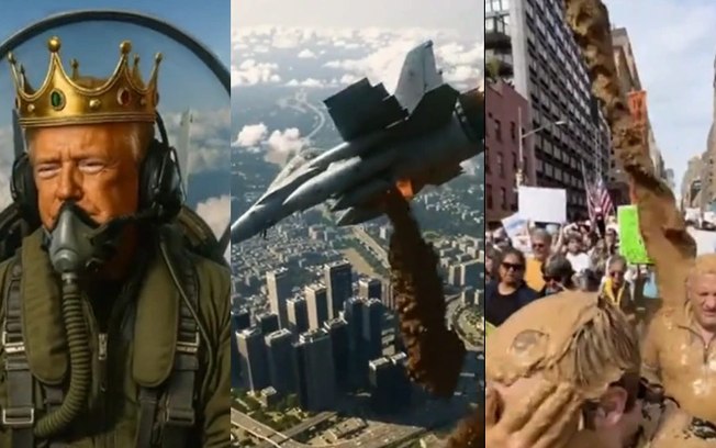 Outro vídeo mostra o republicano com uma espada enquanto pessoas se curvam ao “Rei Trump”, uma ironia ao movimento “No Kings” (“Sem Reis”), que mobilizou a onda de protestos de ontem. As postagens foram feitas na plataforma Truth Social, da qual o próprio presidente é o dono.