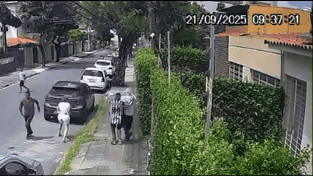 O idoso reagiu, dando tapas no assaltante, que tentava puxá-lo. Logo em seguida, um segundo rapaz, de camisa listrada, chegou por trás e arrastou a vítima. Foi nesse momento que ele deu uma rasteira no idoso, que caiu.