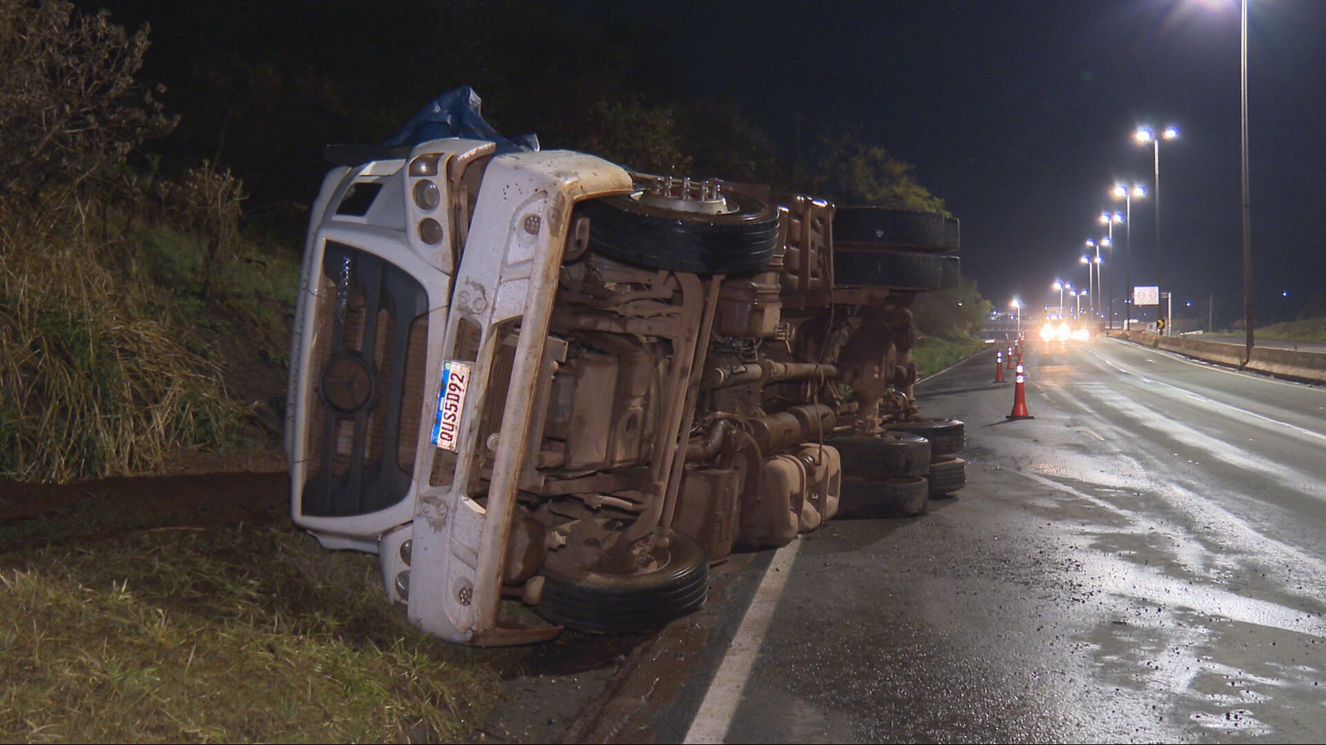 Carreta carregada com minério de ferro tomba e interdita Anel Rodoviário de BH