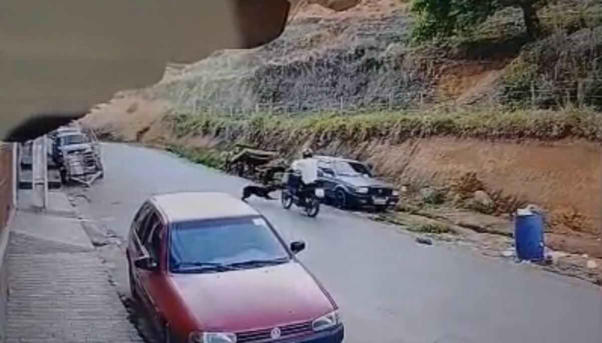 Um motociclista de 51 anos morreu após atropelar um cachorro que atravessou repentinamente a rua em Miraí, na Zona da Mata mineira. Ele caiu da moto após a batida, foi socorrido pelo Samu, mas não resistiu aos ferimentos e faleceu no hospital. Câmeras de monitoramento da rua gravaram o momento da batida. Veja acima.