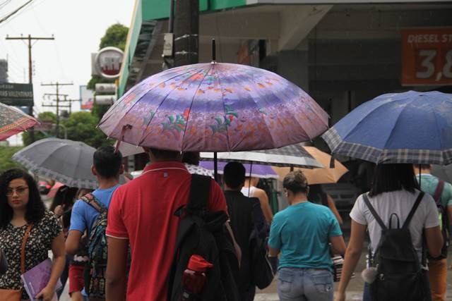 Chuva em Belém – pessoas com guarda-chuva e sombrinha.