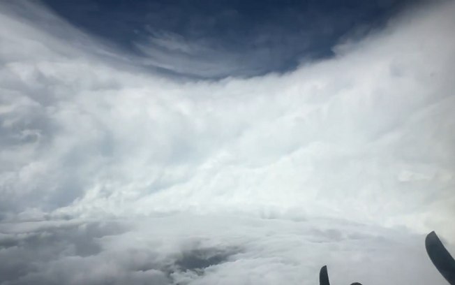 O vídeo, feito durante um voo do 53º Esquadrão de Reconhecimento Climático dos EUA, mostra uma parede de nuvens em formato cilíndrico, elevando-se a milhares de metros, enquanto o centro da tempestade revela céu azul e luz solar, um contraste em meio a ventos de mais de 260 km/h.
