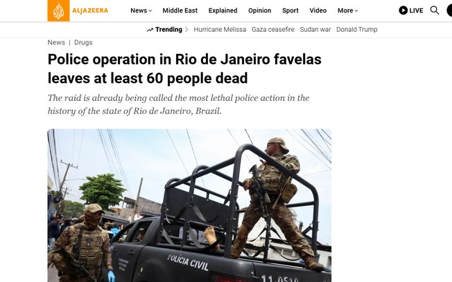 Al Jazeera informou que a “Operação Contenção” nas favelas do Alemão e da Penha resultou em 64 mortos, incluindo quatro policiais. A rede de televisão estatal destacou que o Brasil ocupa o segundo lugar no mundo no consumo bruto de cocaína e afirmou que operações policiais contra organizações criminosas não são incomuns nas favelas brasileiras, e muitas acabam sendo letais.
