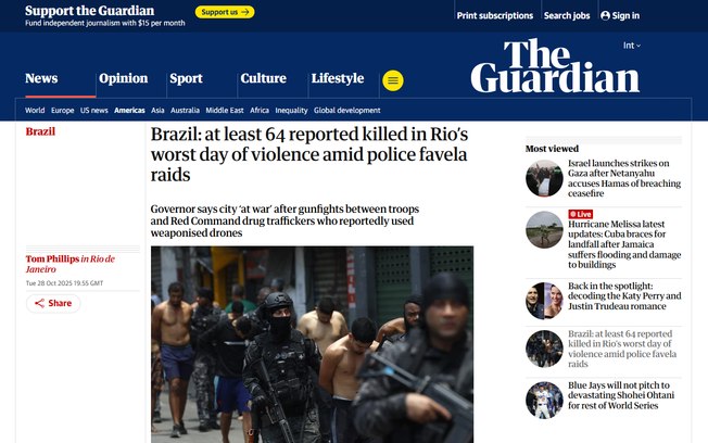 O The Guardian classificou a operação contra o Comando Vermelho no Rio como o pior dia de violência no Rio durante operações policiais em favelas.Reprodução/The Guardian