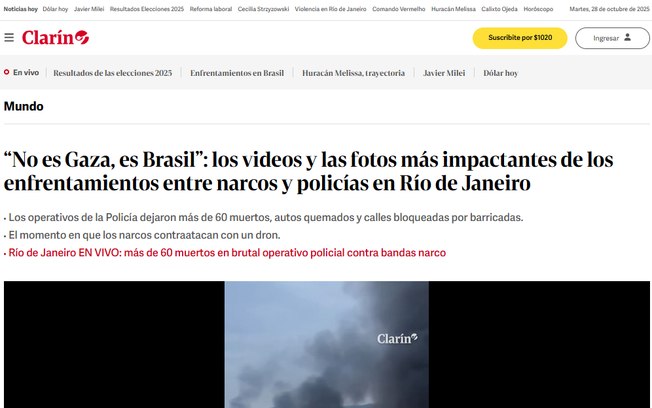 O jornal argentino Clarín comparou o confronto entre policiais e traficantes no Rio de Janeiro a uma verdadeira zona de guerra. Foram compilados vídeos que circulam nas redes sociais e fotografias que mostram carros queimados, cenas de tiroteios, ataques com drones e dezenas de suspeitos rendidos pela polícia.