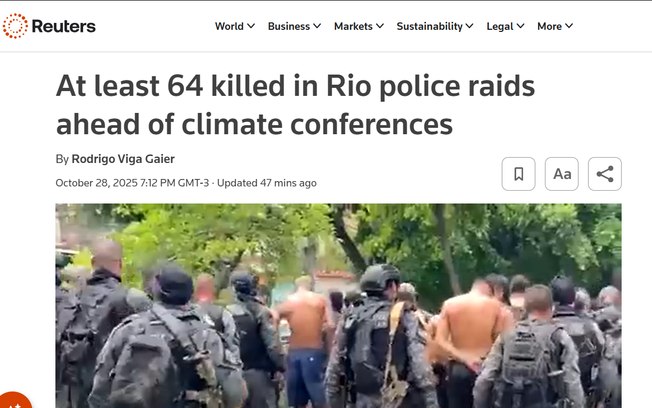 A agência Reuters destacou a proximidade da operação com a COP30.Reprodução/Reuters