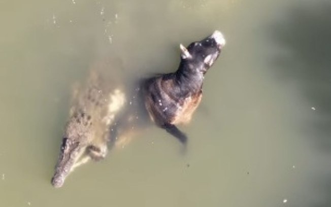 Um fotógrafo da vida selvagem registrou um momento impressionante no norte da Austrália: um crocodilo gigante devorando uma vaca que havia caído em um rio. As imagens foram capturadas por Kjell Hensen, que compartilhou a cena nas redes sociais.