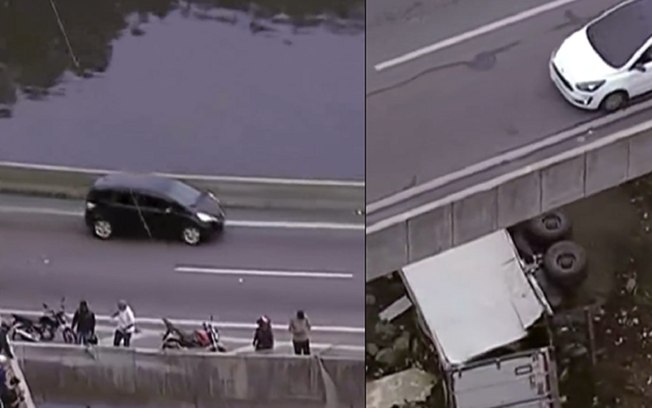 Um caminhão caiu de uma ponte sobre o rio Tietê, na Marginal, no fim da tarde desta quarta-feira (5). O acidente mobilizou equipes do Corpo de Bombeiros para o resgate de quatro vítimas, duas delas presas nas ferragens.