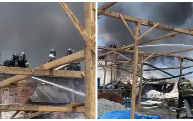 Equipes do Corpo de Bombeiros trabalham no galpão incendiado Reprodução/redes sociais