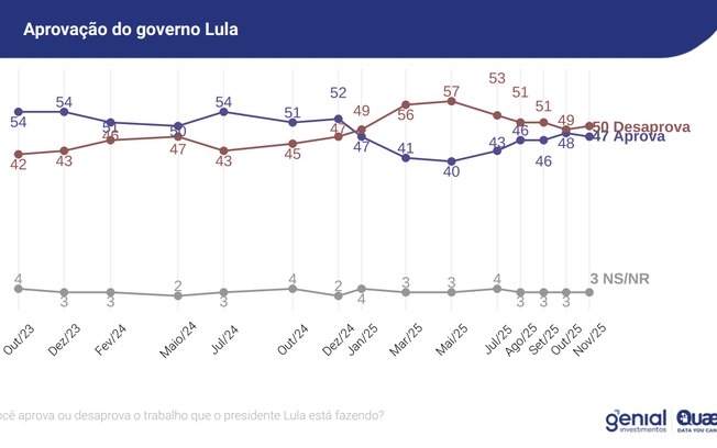 É a primeira vez desde maio que a aprovação do governo oscila para baixo na pesquisa Quaest. De acordo com os pesquisadores, as declarações de Lula sobre a megaoperação policial no Rio, do último dia 28, geraram preocupação sobre a segurança pública.