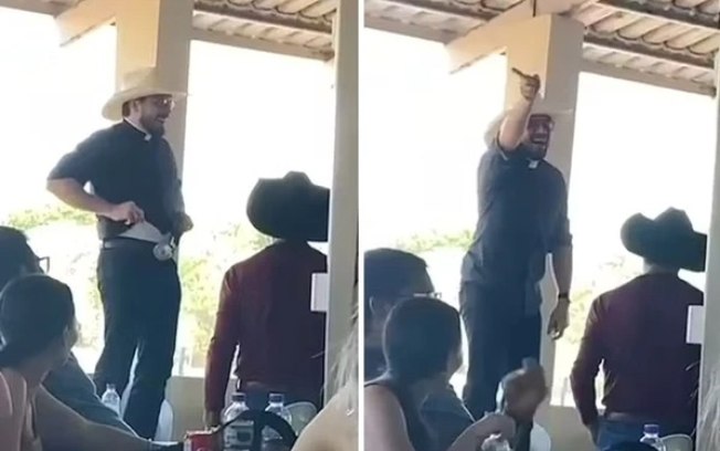 Nas imagens, o religioso aparece vestindo camisa clerical e chapéu de vaqueiro, enquanto o leiloeiro incentiva a plateia a aumentar os lances. Em tom de brincadeira, ele anuncia: