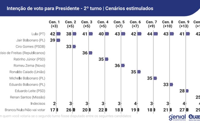 Entre os candidatos atualmente elegíveis, o que mais se aproxima de Lula é Ciro Gomes (PSDB), que teve 33% contra 38% do presidente. Na disputa com Tarcísio de Freitas (Republicanos), o petista teve 41% contra 36%.
