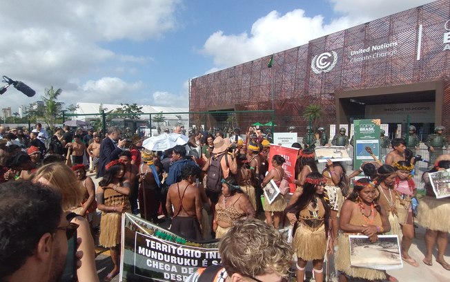 O protesto dos indígenas Munduruku ocorreu na manhã desta sexta-feira (14). Esta foi a segunda manifestação desde o início da COP30. Na primeira ocasião, os manifestantes chegaram a invadir a Blue Zone, designada às negociações diplomáticas.