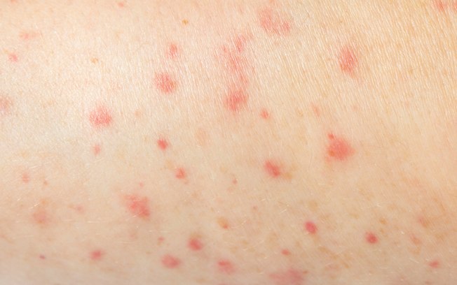A erupção costuma começar com manchas vermelhas planas no rosto, próximas à linha do cabelo, e se espalha gradualmente para o pescoço, tronco, braços, pernas e pés.