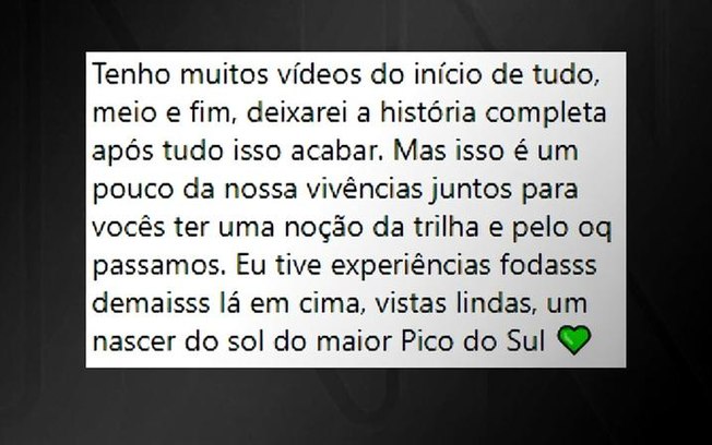 Em outra publicação, Thayane foi mais enfática: “Aprendizado, nunca mais andar com alguém que não é experiente em trilhas, não é seu estilo de vida e não tem pique para isso”.