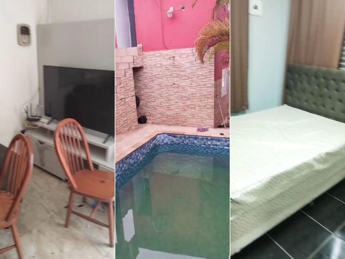 Nas imagens, é possível ver diferentes cômodos do imóvel, como um quarto, sala, cozinha e banheiro. Em uma das fotos, duas garrafas de bebida alcoólica aparecem sobre uma mesa. Também é possível ver sujeira em paredes, móveis e eletrodomésticos (veja abaixo).