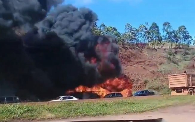 Um ônibus de turismo pegou fogo e cruzou de ré, desgovernado, a Rodovia Fernão Dias na manhã desta sexta-feira (9), em Igarapé, na Região Metropolitana de Belo Horizonte.