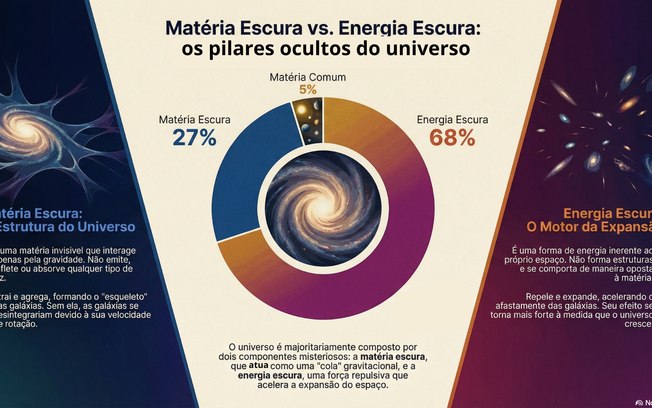 Matéria escura e energia escura são componentes invisíveis que dominam o Universo, uma sustenta a estrutura das galáxias, a outra acelera a expansão do espaço.Gerado com IA.