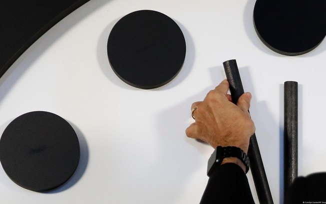 O Boletim dos Cientistas Atômicos moveu os ponteiros para 85 segundos para a meia-noite, ponto teórico do fim do mundo. Isso é quatro segundos a menos do que foi definido no ano passado.