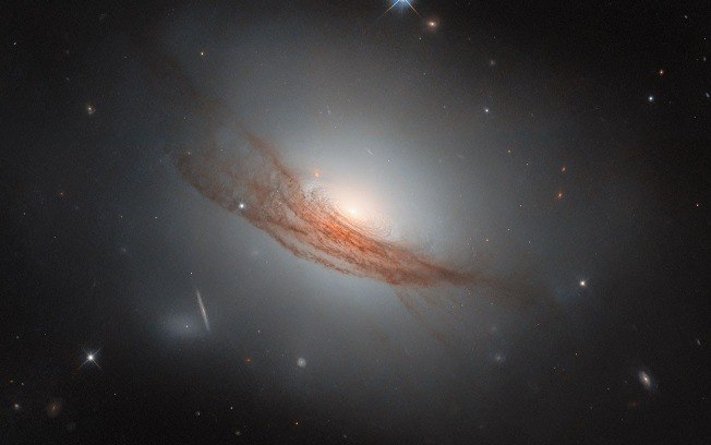 Apesar disso, o que mais chama atenção, são as longas faixas de poeira avermelhada, que “serpenteiam” pela borda externa da galáxia e cortam parte da luz, criando um visual quase que dramático.