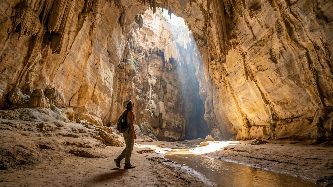 A escala é monumental. O teto das cavernas chega a ultrapassar 100 metros de altura em certos pontos, criando uma atmosfera de catedral subterrânea.