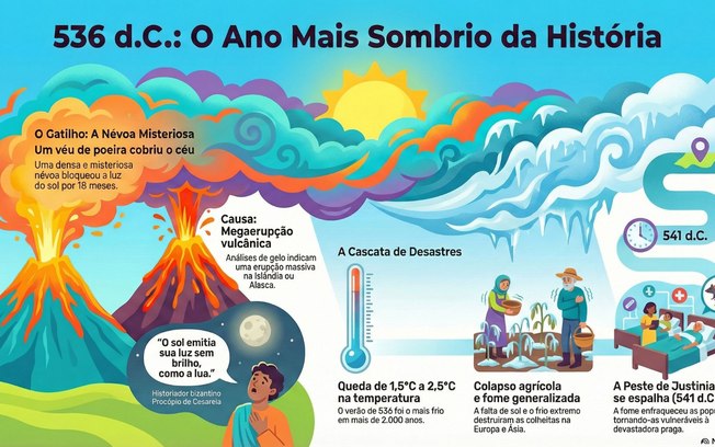 Em 536 d.C., uma série de eventos naturais e suas consequências históricas criaram um dos períodos mais dramáticos da história humana, tão severo que muitos historiadores o consideram o pior ano para se estar vivo. Uma misteriosa névoa escureceu o sol por 18 meses, dando início a uma sequência de desastre climático, social e biológico que mergulhou grandes partes do mundo em escuridão, frio extremo, fome e doença devastadora. As informações são do canal Poeira da História.
