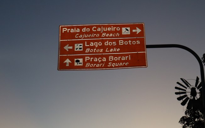 Por fim, as placas de informação turística, com fundo marrom e letras brancas, orientam o acesso a pontos turísticos e atrações regionais.