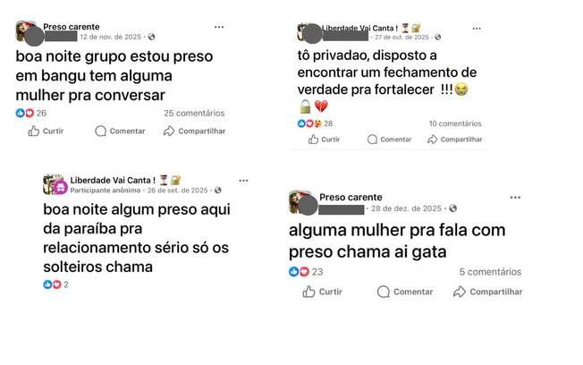 Grupos com nomes como “Preso carente”, “Preso também ama relacionamento sério”, “Preso também ama” e “Liberdade vai cantar” reúnem mais de 100 mil participantes. Nesses espaços, pessoas privadas de liberdade se apresentam e declaram estar em busca de envolvimentos afetivos, muitas vezes com intenção de firmar relacionamentos estáveis.