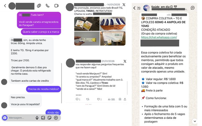 O principal argumento de venda é o preço. Uma caneta emagrecedora regularizada no Brasil, com tirzepatida, custa em média R$ 1,7 mil. Já versões comercializadas como equivalentes, mas sem registro sanitário, chegam a ser vendidas por R$ 300.