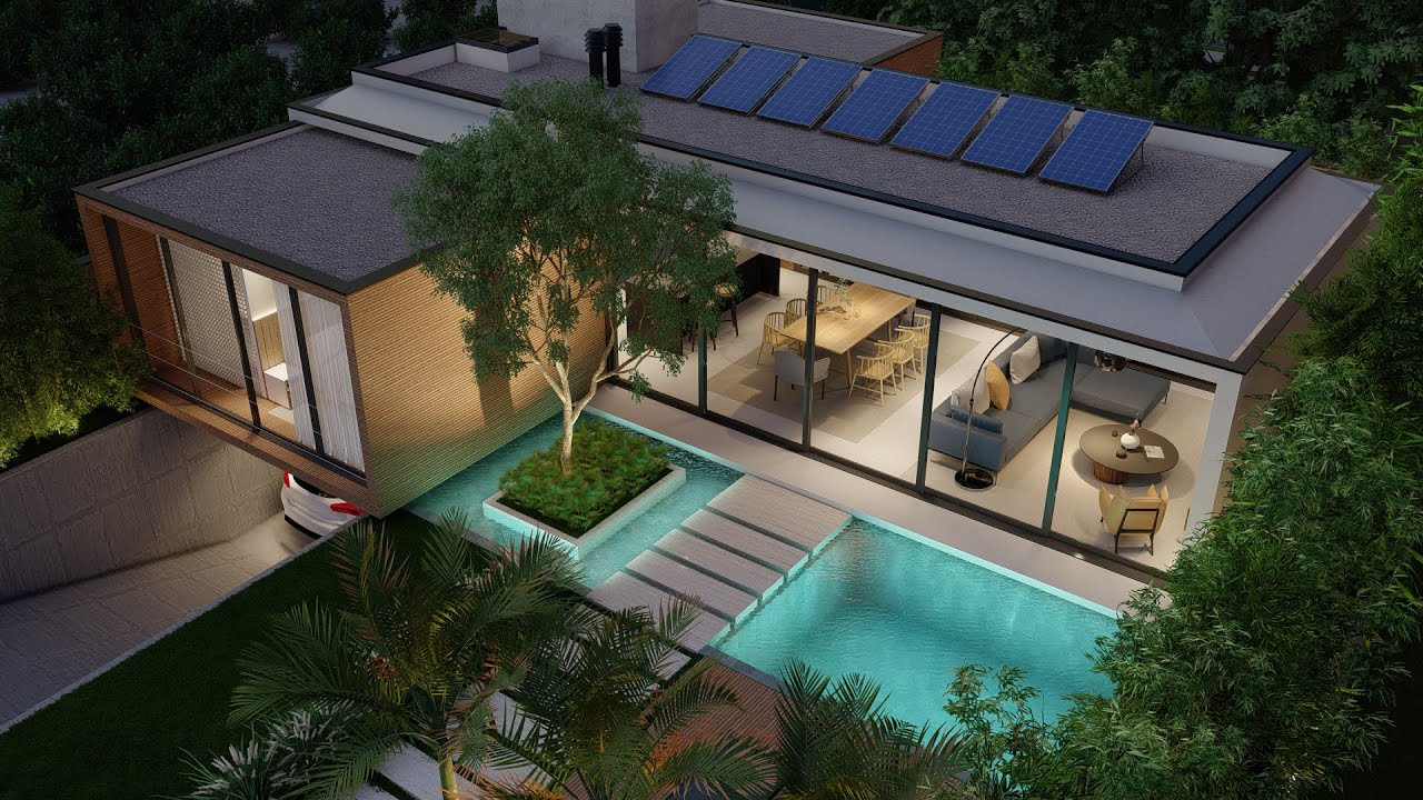 Embora seja uma casa de 2 quartos, o padrão construtivo é elevado. O uso de grandes vãos de vidro, estrutura em balanço (volume suspenso) e tecnologias sustentáveis, como painéis solares na cobertura, exige um orçamento robusto.