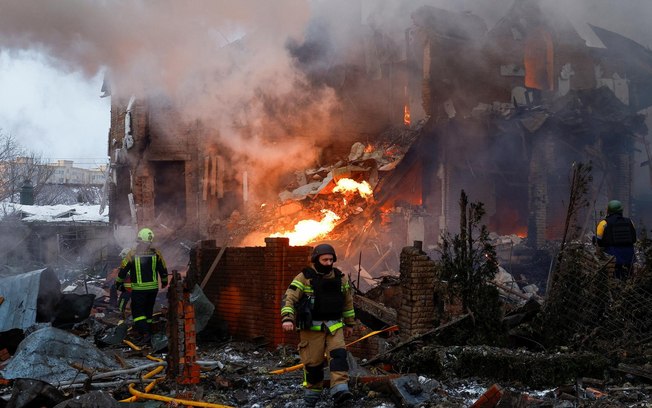 Bombeiros trabalham em casa atingida por bombardeio russo em KievFoto: Reprodução