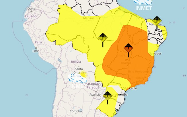 O Instituto Nacional de Meteorologia (Inmet) está com dois avisos ativos para chuvas intensas em grande parte do Norte, Centro-oeste, Sudeste, Sul e algumas áreas do Nordeste. Ambos têm validade até o dia 27 de fevereiro.