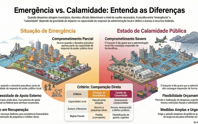 Já o estado de calamidade pública é adotado quando os impactos são mais severos e comprometem de forma significativa a atuação da administração, exigindo medidas mais amplas e urgentes.