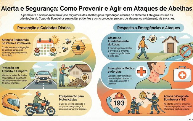 A primavera e o verão concentram o maior número de ocorrências envolvendo ataques de abelhas. Nesse período, os insetos entram em fase migratória, saindo em busca de alimento, reprodução e novos locais para instalar colmeias, o que aumenta a chance de contato com a população.
