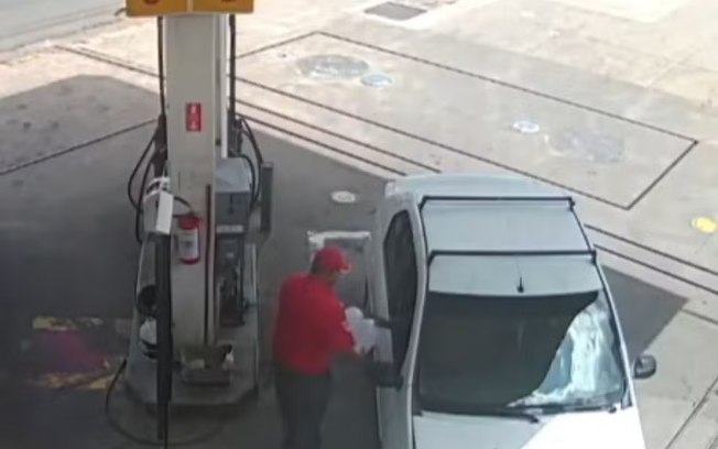 Imagens gravadas por uma câmera de segurança, mostram o homem em um posto de gasolina, na cidade de Hortolândia (SP), entregando galões para o frentista, que encheu os recipientes. O suspeito ainda encheu o tanque, pagou e foi embora.